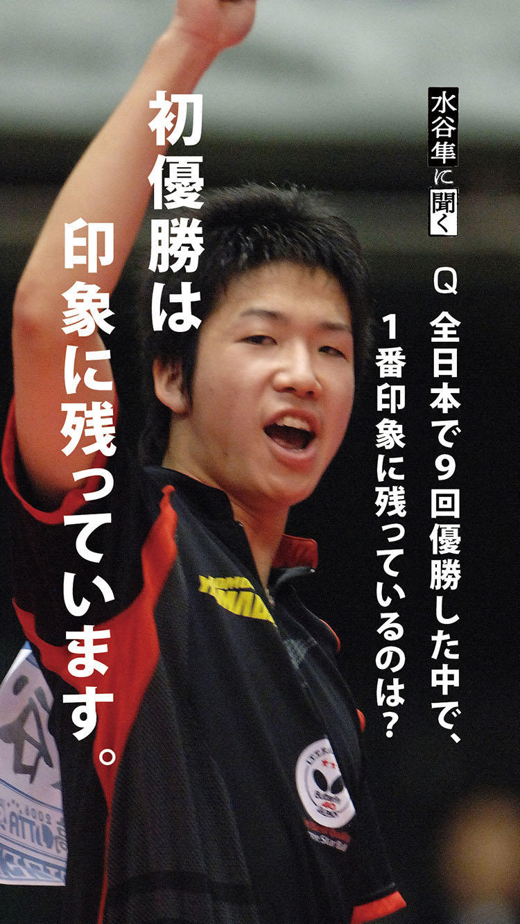 決勝の相手は吉田海偉だった。全日本3連覇をかけて臨んだペンホルダードライブ型の吉田は、過去2大会と比べると不調の様子だった。水谷は、全日本で決勝に進むのは初めてだったが、全日本決勝の雰囲気にのまれることなく、「緊張はありませんでした。1台のコートで最後にプレーできるうれしさを感じていました」と、伸び伸びとプレーしていた。