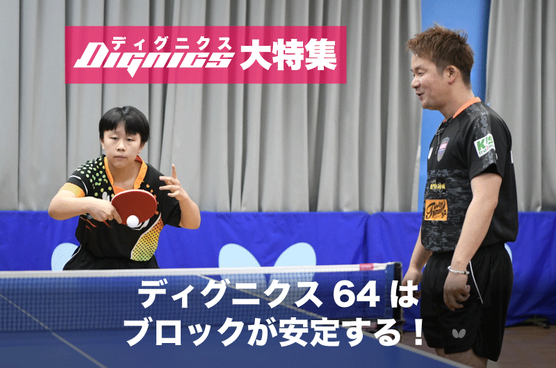 ディグニクス64は、ラバーが少し軟らかいのが特徴です。ラバーが軟らかいと相手のボールの勢いを抑えやすいので、ディグニクス64はブロックに向いていると思います。ドライブをブロックした時に打球が暴発しない(不安定にならない)ので、選手に安心感を与えてくれるラバーです。