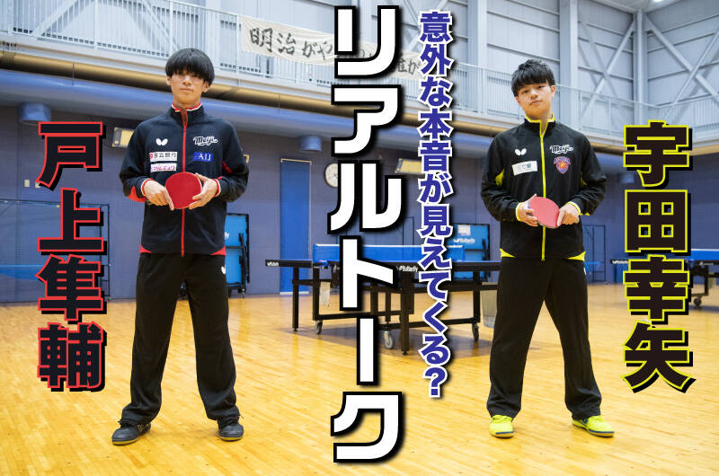 今年の全日本卓球選手権大会で表彰台に登った宇田幸矢と戸上隼輔。卓球レポートは、ともに明治大学に進学した2人に、コロナ禍でどのように過ごしたか、先の全日本について、また、卓球選手として、友人としての互いについて余すところなく語ってもらった。