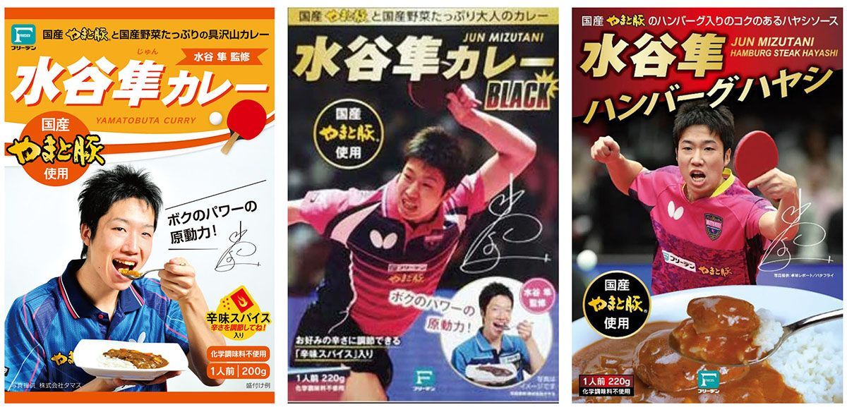 左から水谷隼カレー、水谷隼ブラックカレー、水谷隼ハンバーグハヤシ