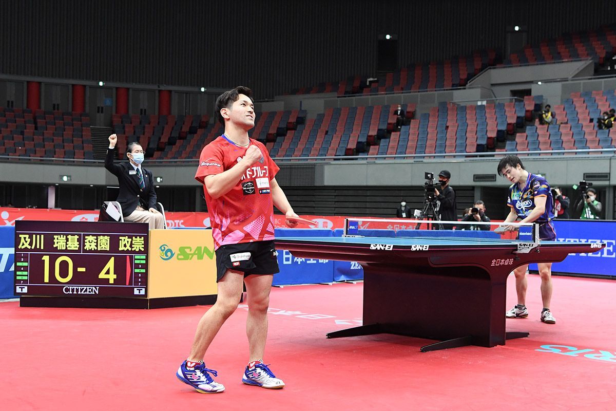 及川 決勝は、やはり、0対2の1-4で取ったタイムアウトが大きかったですね。試合前に、邱さん(邱建新/木下マイスター東京総監督)と立てていた戦術は、バック側に深くツッツいておけば一発で決められるボールはないので、そこからラリーをすれば大丈夫というものでした。サービスは、体を入れたフェイントを使ったサービスやロングサービスを多用するという戦術でしたが、それがあまりできていなかったので、タイムアウトの時に邱さんに、その戦術で思い切っていけと言われました。
