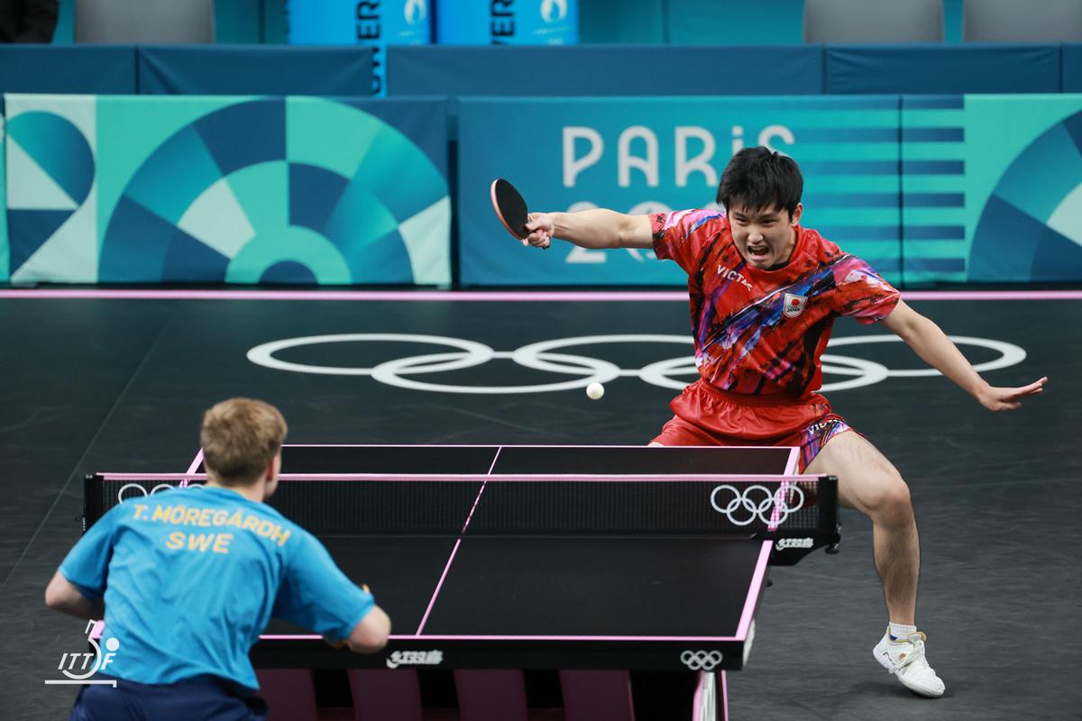 張本 正直、どうなるかまったく予想がつきませんでした。例えば、林昀儒だったら過去の対戦があるから、こうなってこうなって、勝つにしても負けるにしても最後は3対2かなとか予想できますが、モーレゴードは前回ユースオリンピック(2018年ブエノスアイレス大会)で対戦してから6年くらい対戦がなくて、世界ランキングは僕の方が上ですが、今大会の勢いはすごいし、団体でもオフチャロフ(ドイツ)に負けそうなところから逆転していたし、樊振東(中国)以外には負けていませんでしたからね。本当に何をしてくるか分からないトリッキーな選手なので、1ゲーム目、入りは怖かったですけどギリギリで取れて、10-9でロビングから巻き返されて取られた時にはいつものモーレゴードの逆転するパターンだと思いましたが、11-11でフォア側にツッツキレシーブが決まりました。あれはちゃんとデータをインプットしていて、サービスを出してすぐに回り込むのが彼の癖なので、サービスがバック前に来てもフォア側に行こうと思えました。あれはいい対策でしたね。