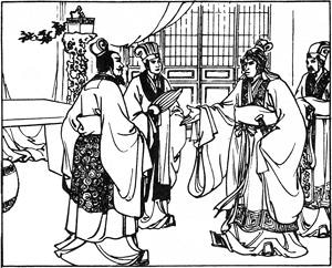 更に項王は使者を漢王へ出し偵察させた。この時、陳平は再度「わな」を仕掛け、沢山(たくさん)のご馳走(ちそう)と美酒をもって楚の使者をもてなし、範増の近況を尋ね、彼からの親書を持っていますかと聞いた。