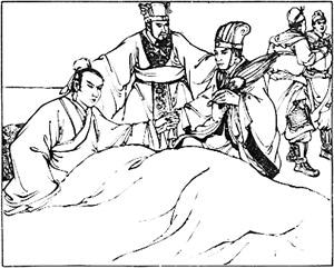 一方、朝廷の曹爽は李勝(りしょう)を荊州刺史(官名)に命じ、お別れの挨拶(あいさつ)を名目に、司馬懿の自宅を訪ねさせ、近況を探らせた。知らせを聞いた司馬懿は、すぐ床に入り、頭冠を捨て、髪の毛を乱し、歩く時は二名の召し使いに両脇(りょうわき)を支えてもらった。李勝の荊州(けいしゅう)赴任の話に対し、わざと併州(へいしゅう)に聞き違い、耳が遠くなったとぼやき、召し使いが差し出したお茶もまともに飲めないふりをして衣服にこぼした。暫くして司馬懿は李勝に「私は年老い、病の身。今日明日にでも死ぬであろう。出来の悪い息子二人であるが、大将軍にお会いの節は、是非宜しくお願い申す」と言いながら咳きこみ、風前の灯(ともしび)の様子であった。李勝は別れを告げると、そのまま曹爽が待つ朝廷へと急ぎ、司馬懿の老いた姿を報告した。「司馬懿が死ねば、私は高枕で眠れる」と曹爽は喜んだ。