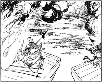 紀元208年三国時代の赤壁の戦の時、東呉の孫権(そんけん)は劉備(りゅうび)と連合して、曹操(そうそう)の大軍に立ち向かった。劉備の策士龐統(ほうとう)は、曹軍が水上戦を苦手としている弱点を利用し、早速曹営(曹操の陣営)に潜り込んで、策を曹兵達に話した。