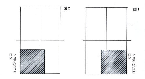 図1、図2の斜線の範囲にランダム(不規則)にボールを出してもらって、動いてフォアハンドで打つ。慣れるにしたがって、少しずつ打球のスピードを速めたり、タイミングを早くしたり、難易度を高めていくようにする。