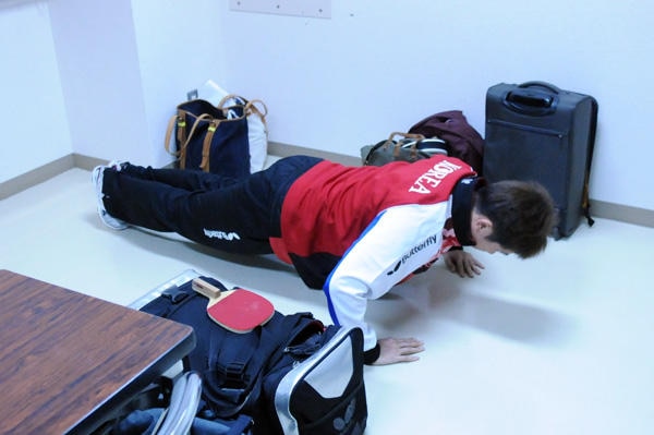 (おまけ:控え室でウオームアップする柳承敏。やはり腕立て伏せは必須のようです。呉尚垠の腕立て伏せが見たいという方は卓球レポート7月号の「Photo Story」をご覧ください)