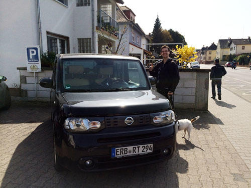 撮影前に軽く昼食をとろうとボルの実家(ボルは現在実家から車で数分のところに奥さんとお子さんと愛犬と住んでいます)近くのイタリアンに入ると、食べ終わるころにボルが愛車のキューブに乗ってやってきた。ボルはドイツ車を所有していて、このキューブは2台目の車。そういえば何年か前に「キューブのデザインのかわいさに惚れて、特別に取り寄せた」と言っていたことを思い出した。