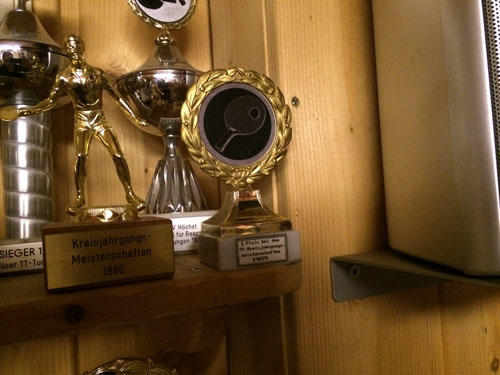 帰り際、ボルが卓球を始めたときに父親と練習していた地下室に来てくれと言われて、一緒に降りた。そこはボルがこれまで獲得した優勝カップや賞状、新聞記事などの切り抜きが飾られていて、小さいながらも「ティモ・ボル記念館」に変わっていた。