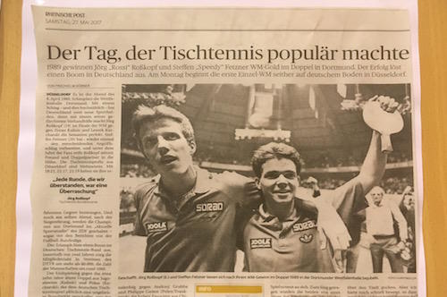 世界卓球デュッセルドルフ大会の開幕前に、ドイツの新聞各紙で卓球の記事を掲載している。会場内に設営されたプレスセンターにはその切り抜きが張り出されているが、中でも目を引くのは「RHEINISCHE POST(地方紙)」が「Der Tag, der tischtennis popular machte(卓球が普及した日)」という見出しとともに掲載した記事。