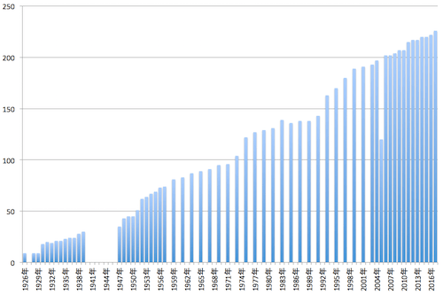 国際卓球連盟 加盟協会数の推移今大会の模様は卓球レポート7月号(6月20日発売)に掲載