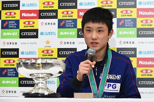 「今大会の一番の目標が男子シングルスの優勝とジュニア男子での優勝で最後に目標を達成できてよかったです。(決勝の水谷戦は)前回勝った世界卓球のときのように自分が攻めていくような卓球をして勝ちたいと思っていたのでそのようなプレーができて良かったです。1ゲーム目を11-9で取れて勢いに乗れたので、出足が一番大事だったと思います。