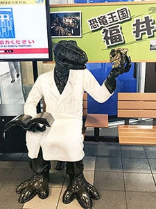 恐竜推しの福井県。写真の方はもちろんオオモリさんではありません 大会取材で全国さまざまな場所にお邪魔していますが、まだ行ったことがないところもいくつかあります。第45回高校選抜が行われた福井県もその一つでした。選手たちの熱戦ももちろんですが、ご当地グルメも楽しみの一つ。福井といえば、鯖やカツ丼が有名なんだなと事前に情報を仕入れながら取材に臨みました。高校選抜は、主軸を担っていた3年生が抜けて新チームで臨む大会です。どのチームも手探り感があるため、接戦が多くなりがちです。予想通り今回も熱戦が続き、タイムテーブルが押しに押して、会場を出たのが夜の10時近くでした。
