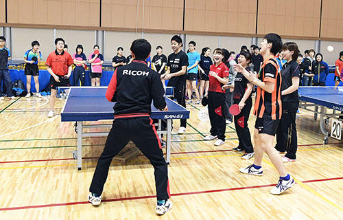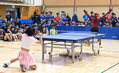 「体感コーナー」と題し、日本リーガーたちの自慢のサービスやチキータ、一撃ドライブなどを参加者たちが受けるコーナーから始まり、9-9からの日本リーガーへのチャレンジマッチや、日本リーガーと参加者たちが合同チームを組んでラリー回数や的当ての早さを競い合う団体戦、笑いあり真剣ありの模範試合など、内容は斬新で盛りだくさん。