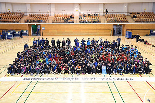 交流会が終わり、参加者と選手全員で記念撮影ビッグトーナメントが行われた翌日、出場した選手たち約50人と開催地である宮城県近隣の小中高生たち約250人による交流会が開催されました。この交流会は選手たちが主導で企画したもので、タイトル通り、トップ選手たちと地元の小中高生とのふれあいをテーマにしたイベントです。