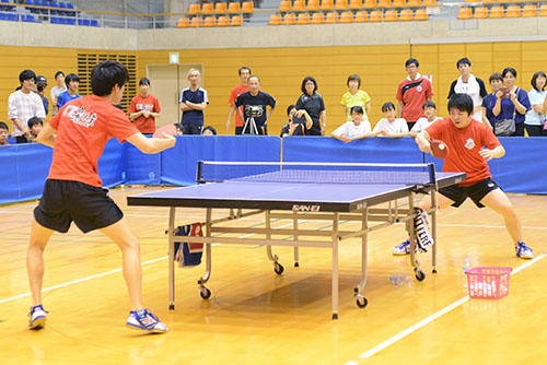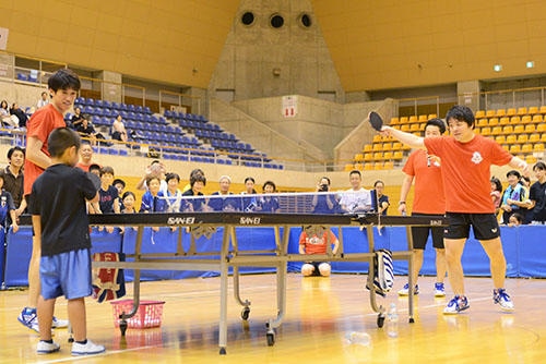 初級者に手を取って丁寧に指導する岸川選手午後の部は、吉村真晴選手(名古屋ダイハツ)も加わり、よりエンターテイメント性が強いイベントになった。吉村選手と岸川選手の一流のテクニックを肌で体感するコーナーや、両選手によるエキシビジョン、チャレンジマッチ、質問コーナー、抽選会、サイン会と盛りだくさんの内容で、T.T彩たまとファンとの距離がぐっと近づいたイベントになった。