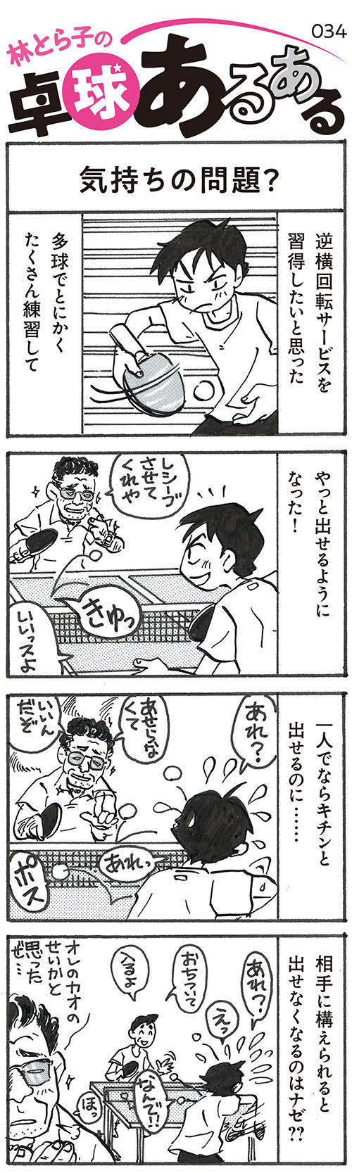 [マンガ] 4コマ漫画 「林とら子の卓球あるある」34 気持ちの問題? 2019.01.02 ツイート シェア そうだ、平野友樹選手の記事を参考に、逆横回転サービスを究めましょう! これまでのマンガはこちら \この記事をシェアする/