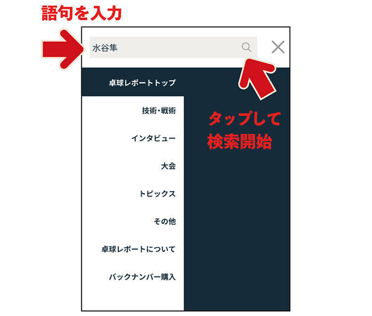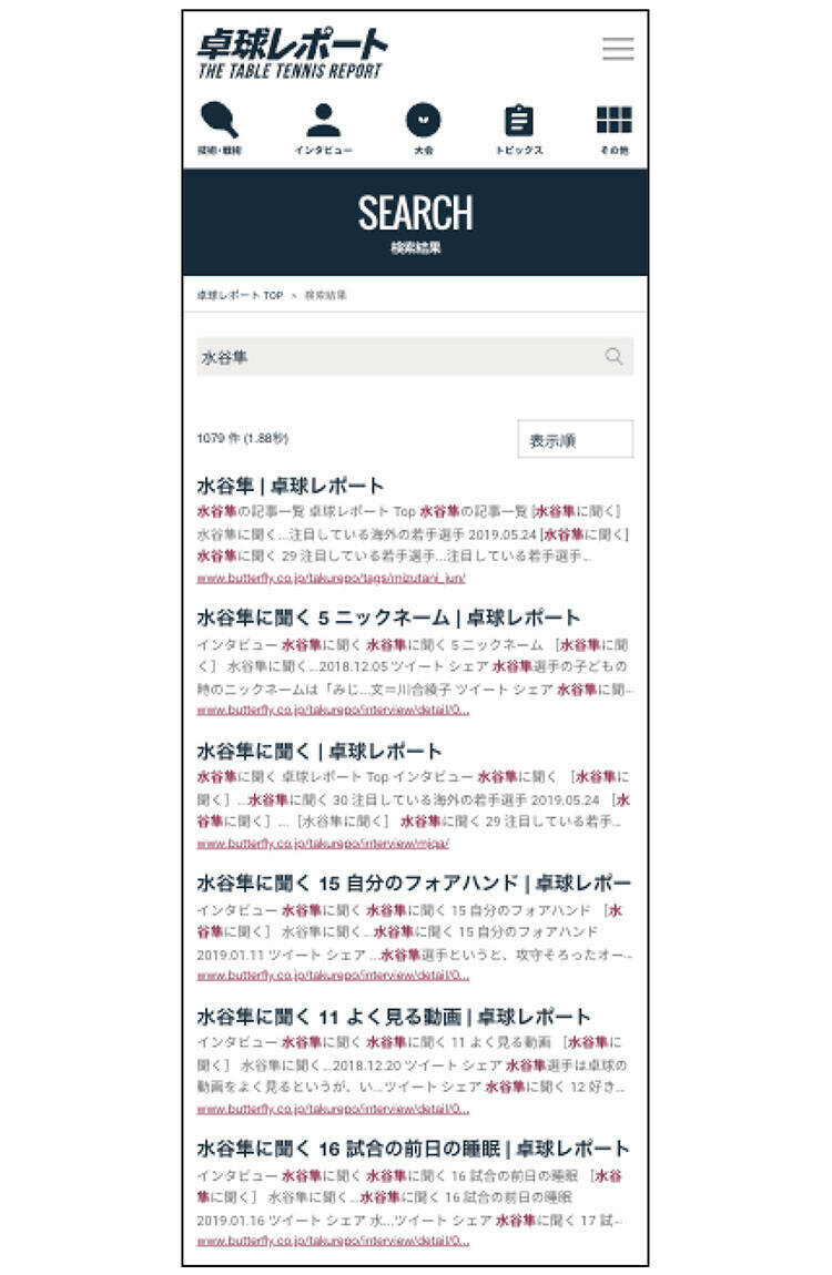例えば、水谷隼選手に関する記事を検索したい場合は「水谷隼」と入力します。