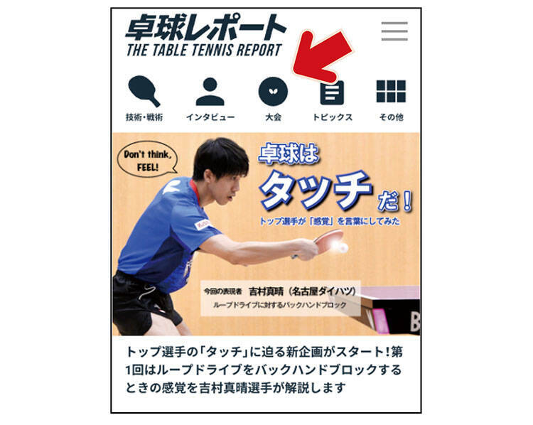 まず、サイトの上の方にある「技術・戦術」「インタビュー」「大会」「トピックス」「その他」というところをタップ(クリック)します。仮に、「大会」というカテゴリーを選んだとしましょう。