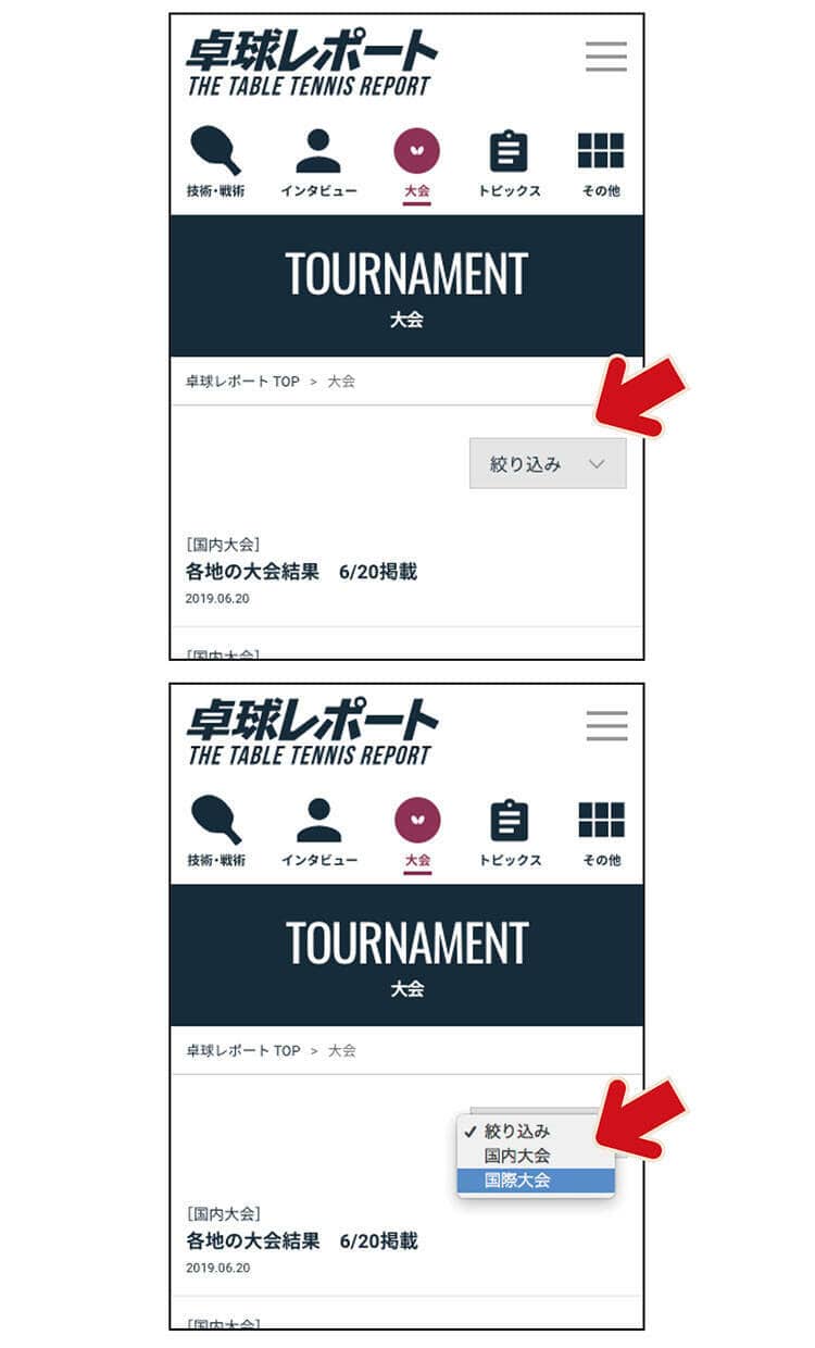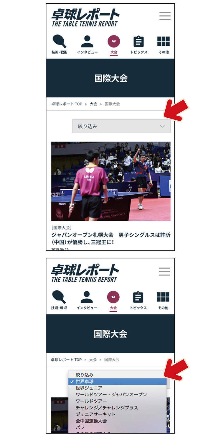 この時、また右上の方に「絞り込み」という欄が表示されます。ここで「絞り込み」の欄をタップ(クリック)すると、「世界卓球」「世界ジュニア」「ワールドツアー・ジャパンオープン」などの選択肢が出てきます。ここで、先ほどよりもさらに一段階、見たい記事を絞り込むことができます。