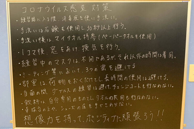 野田学園では3月1日に卒業式を短縮して行い、翌3月2日から、クラスター(集団感染)を防ぐという政府の要請に従い、臨時休校になりました。その時点で、山口県では感染者は発生していませんでしたが、ただちに学校関係者や保護者たちと相談し、同意を得た上で、卓球部の活動を細心の注意を払って継続していくことを判断しました。