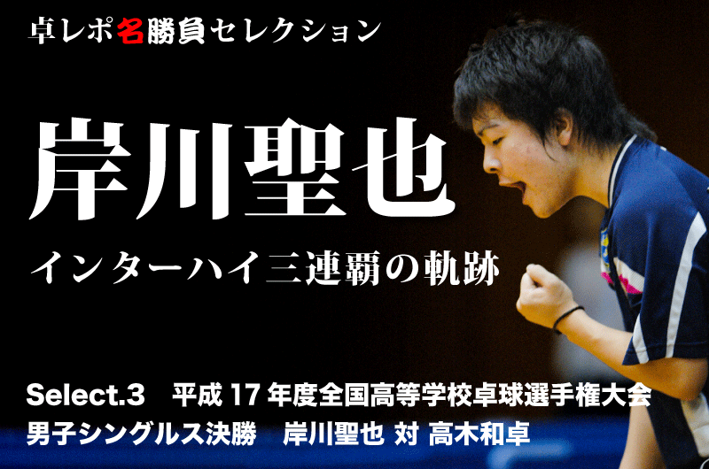 卓球レポートは国内外のさまざまな大会へ足を運び、およそ半世紀にわたり、あまたの熱戦を映像に収め続けてきた。その膨大な映像ストックの中から、語り継がれるべき名勝負を厳選して紹介する「卓レポ名勝負セレクション」。 今シリーズは、岸川聖也(ファースト/当時 仙台育英高)の全国高等学校卓球選手権大会(以下、インターハイ)男子シングルス三連覇の軌跡を紹介している。 最後は、高木和卓(東京アート/当時 青森山田高)との平成17年度(2005年)インターハイ男子シングルス決勝をお届けしよう。