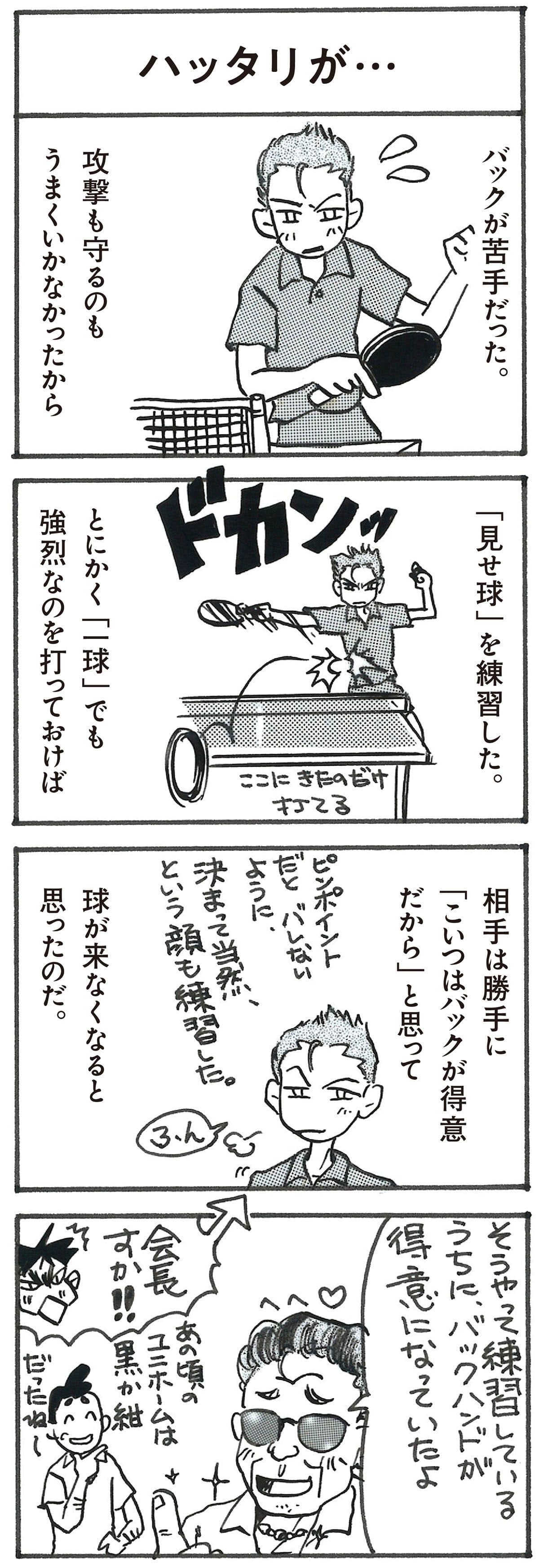 4コマ漫画 「林とら子の卓球あるある」140 ハッタリが...