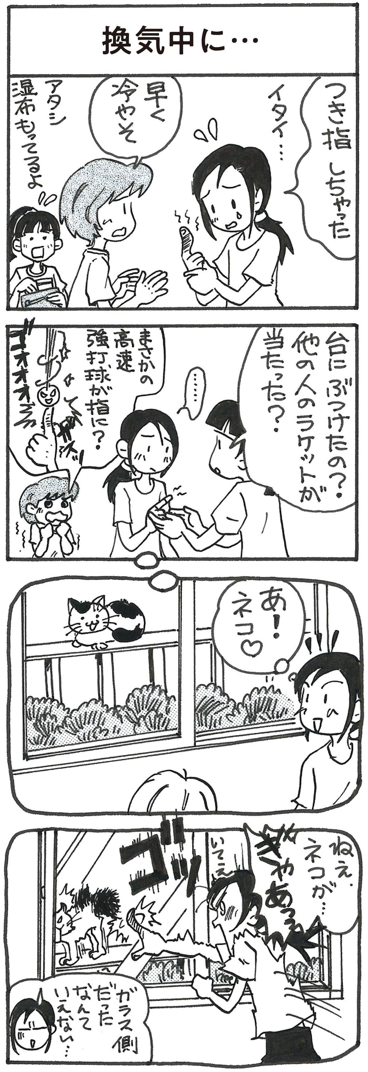 4コマ漫画 「林とら子の卓球あるある」147 換気中に...