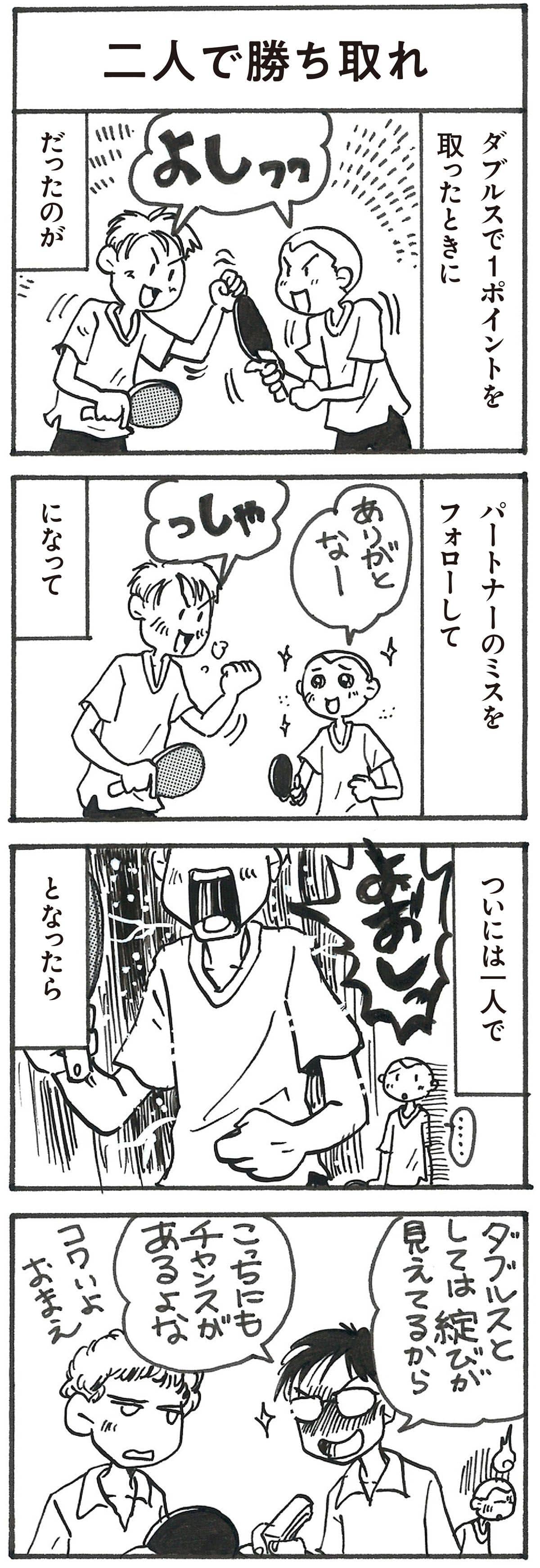 4コマ漫画 「林とら子の卓球あるある」149 二人で勝ち取れ