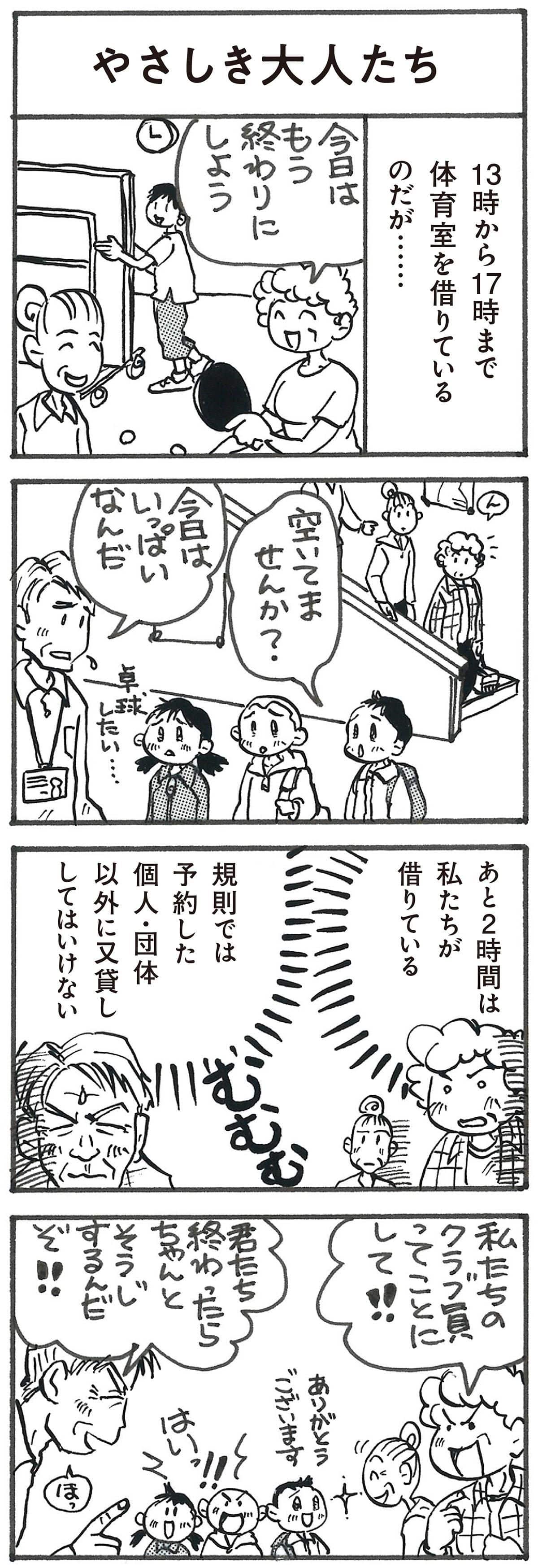 4コマ漫画 「林とら子の卓球あるある」153 やさしき大人たち