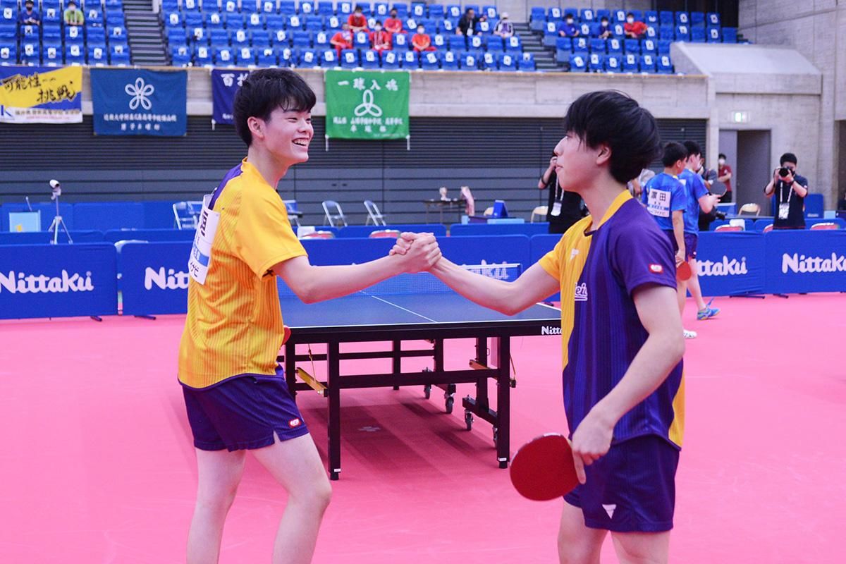 [その他] インターハイ、5日目の試合速報はツイッターで! 2021.08.16 ツイート シェア 第90回全国高等学校卓球選手権大会、通称インターハイが8月12日より富山市総合体育館で開催中。5日目は、男女学校対抗の決勝、男女シングルス2回戦から5回戦までが行われます。 5日目の試合速報はツイッターで!試合が一段落したら、より詳しい報道記事をアップしますので、そちらもお楽しみに! ※写真は、男子ダブルスで優勝した篠塚(右)/谷垣(愛工大名電) \この記事をシェアする/
