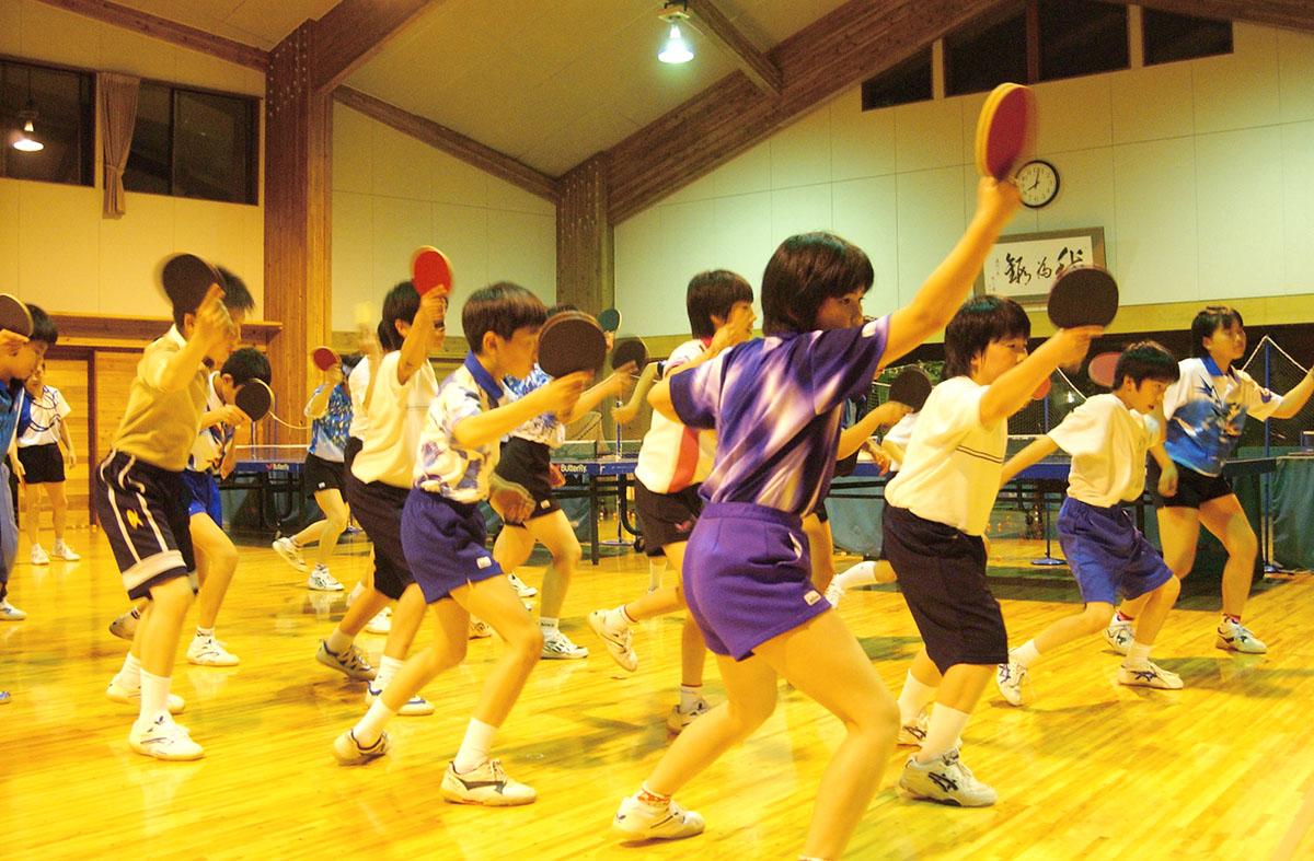 夜の卓球教室では、子どもたちに本当の「基本」を教える。ここでは素振りをとても大切にする。2時間の指導時間のうち30分を、素振りに費やすのである。素振りの指導のときには体の軸を意識させるために、直立姿勢でラケットを振らせることから始める。そして、大きくスタンスを広げての素振りや、フットワークを入れての素振りをする。