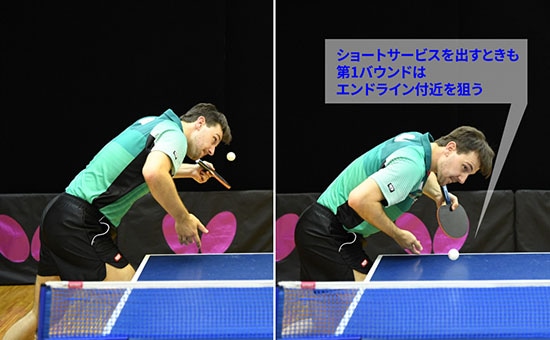 「第1バウンドはエンドラインの近くを狙って、第2バウンドが相手コートのネット際あたりになるようコントロールします。そうして、サービスを短く出すことが重要です」とボルはポイントを述べる。