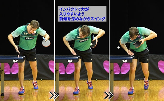 動作では、頭を低くしながらスイングしている点を参考にしてほしい。頭を低くし、前傾を深くする勢いを利用すると、インパクト(打球の瞬間)に力が入りやすいので、小さくスイングしてもボールに回転をかけやすい。また、前傾を深くして頭とインパクトを近づけると「打球タイミングが計りやすい」「コントロールがよくなる」などのメリットも生まれる。