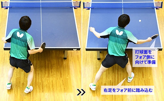フォア前に来たストップ(下回転)に対して流すときは、まず、右足をフォア前(右斜め前)に小さめに運んでボールに近づきながら、「打球面をクロス(右利きの相手のフォア側)に向ける」ことがポイントです。そうすると、相手にフォア側を警戒させることができるので、ストレート(右利きの相手のバック側)に流したときの効果が高まります。