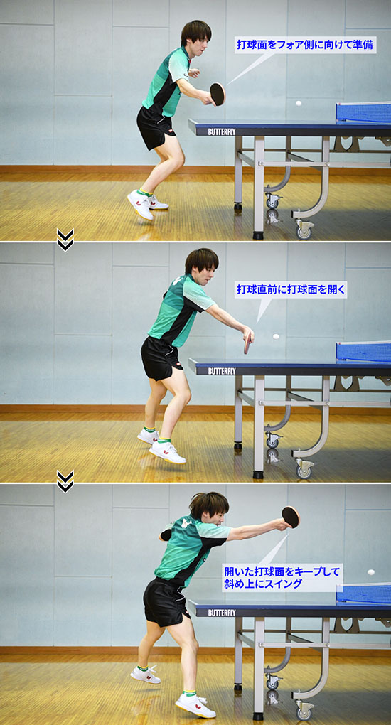 打球面をクロスに向けて、相手にフォア側を警戒させる