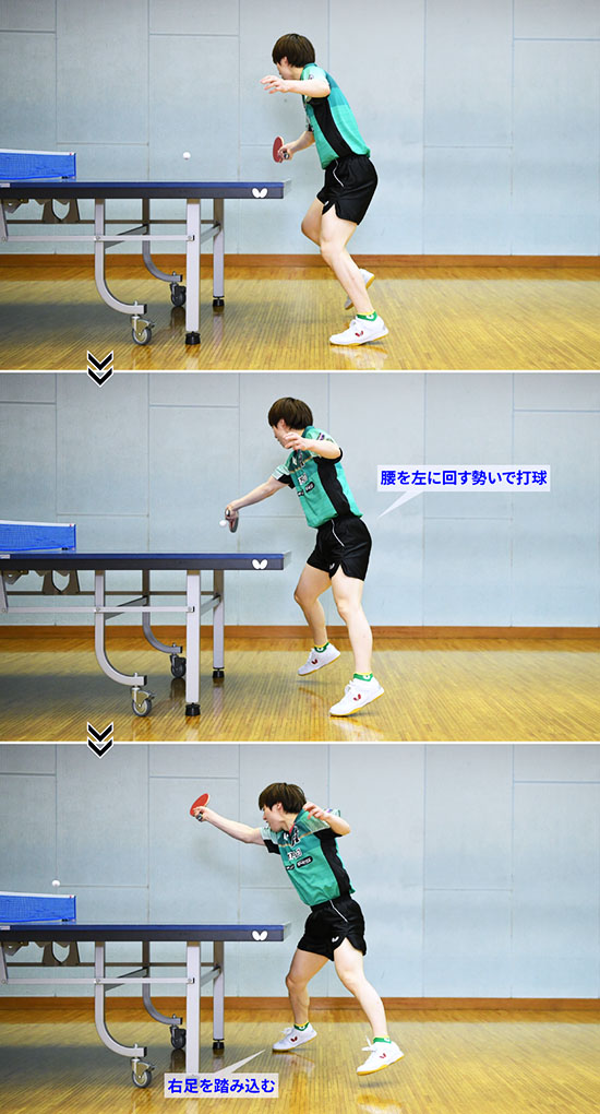 具体的には、「腰を左に回す勢い」を利用しましょう。そうすると、スイングが鋭くなるので打球にスピードが出ます。また、腰を左にひねる動作が相手にフォア側を警戒させるフェイントになるので、流しの効果も高まるでしょう。