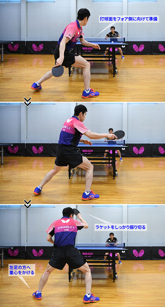 ラケットを振り切ると重心が自然と左足の方にかかり、バック側へスムーズに動きやすくなります。このとき、フォアハンドドライブのスイングが中途半端だと、重心の位置が不安定になり、バック側へスムーズに動くことができません。