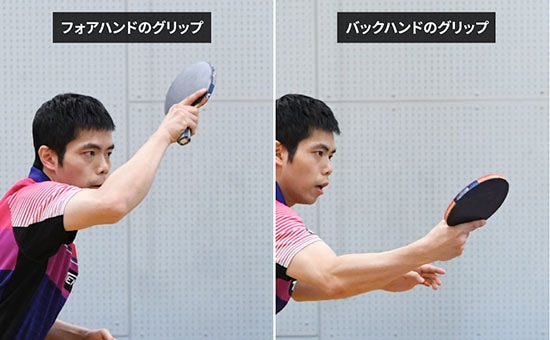 私が両ハンドを切り替えるときは、グリップ(ラケットの握り)をほとんど変えません。フォアハンドドライブもバックハンドドライブもほとんど同じグリップで行います。同じようなグリップで両ハンドを打球すると、グリップを切り替える時間を省くことができるので、その分、両ハンドの切り替えをスムーズに行うことができます。両ハンドの切り替えがスムーズにできないという選手は、フォアハンドもバックハンドもグリップをあまり変えずに打球することを心掛けてみてください。
