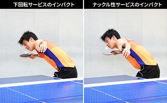 縦回転系サービスは、よく切れた下回転サービスと、その布石となるナックル性サービスとを組み合わせることで初めて効果を発揮する。ナックル性サービスとは、意図的に下回転をかけないサービスのことだ。