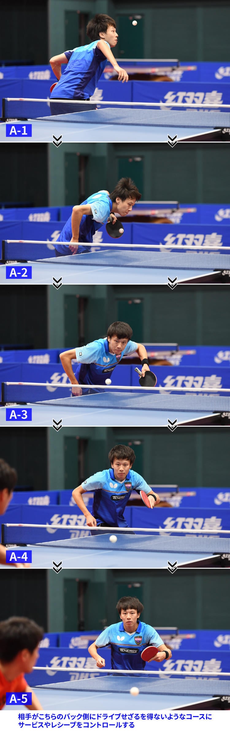 写真A-1~5は、林高遠が前陣バックハンドカウンターで3球目攻撃するときによく使うフォアハンドでの横回転系サービスだ。