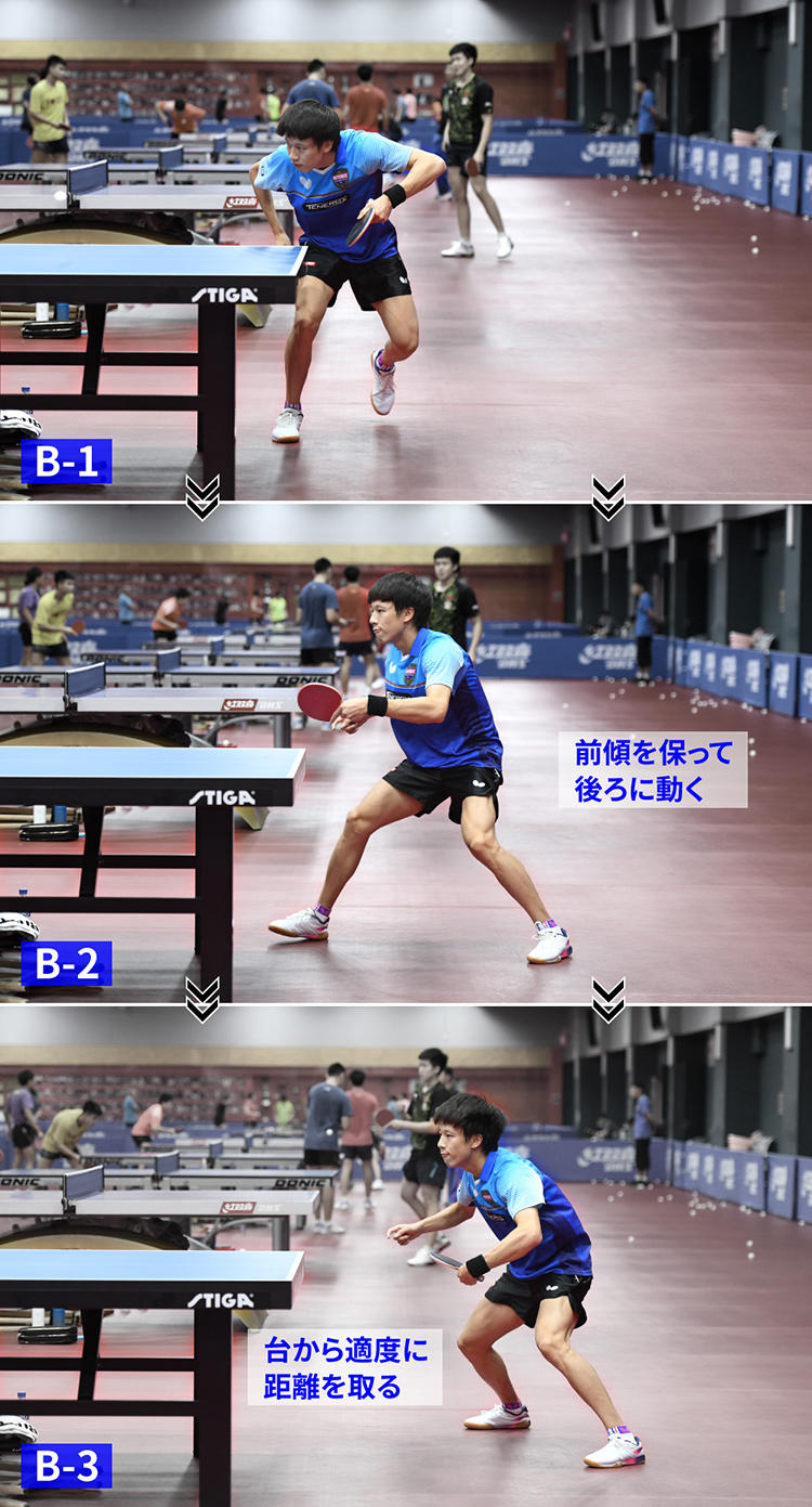 1球前のボールを相手がこちらのバック側にドライブしてくるようなコースに送ったら、台から素早く距離を取ることが、前陣バックハンドカウンターを成功させるために林高遠が行っているポイントだ(写真B-3)。