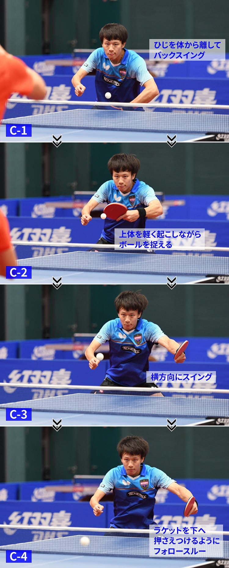フォロースルー(打球後のラケットの動き)でラケットを下方向へ動かしているところも要注目だ(写真C-4)。林高遠のように、フォロースルーでラケットを下に押さえつけるイメージでスイングすると、相手のドライブの回転量を抑えつつ、自分から回転をかけ返しやすくなる。