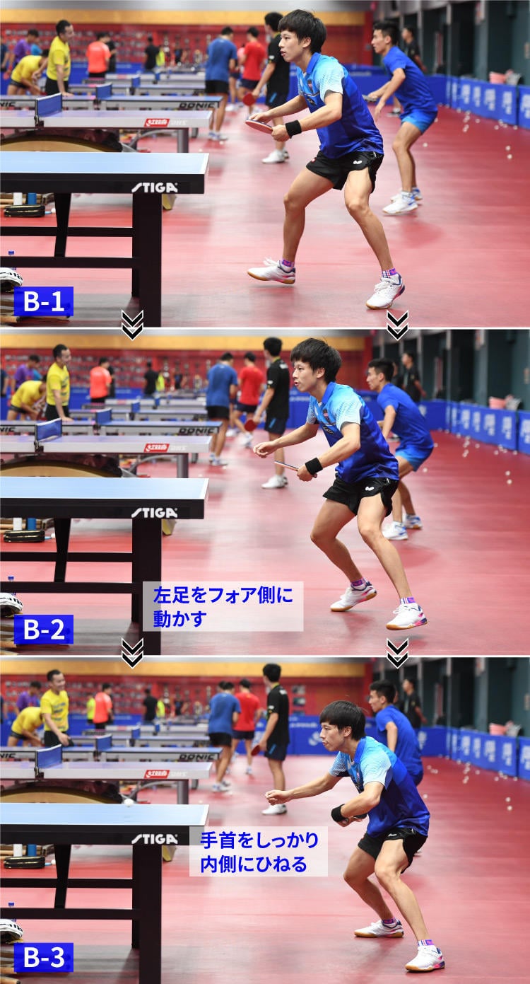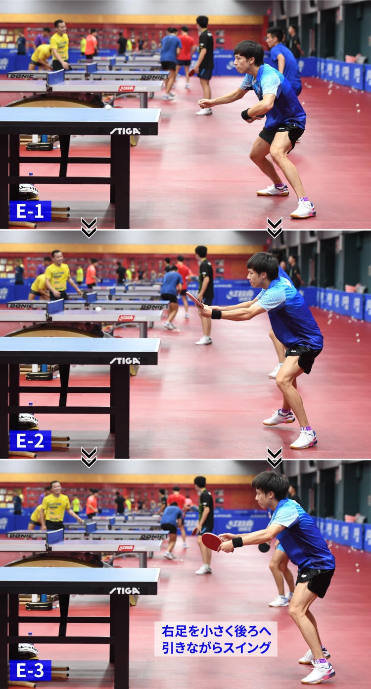 このテクニックを成功させるためには、林高遠の足の動きにも注目だ。林高遠は右足(右利きの選手は左足)を小さく後ろへ引きながらスイングしているが(写真E-1~3)、このように足を引くと、上体が自然と右を向いて手首の返りすぎを防げるため、打球を(右利きの相手の)バック側の厳しいコースへコントールしやすくなる。