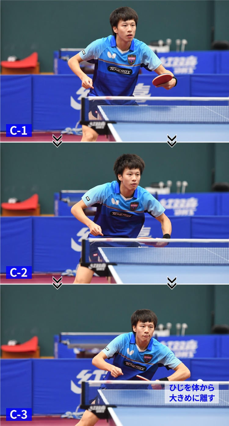 ロングサービスを出した後、ミドルに来たドライブに対して、バックハンドで打球すると判断したら、左足(右利きの選手は右足)をフォア側に動かし(B-1~3)、わきを大きく空けてひじを体から大きめに離して準備することがポイントだ(C-1~3)。このように準備することにより、ミドルに来たボールを体の正面あたりで捉えられるため、正確に打球しやすくなる。