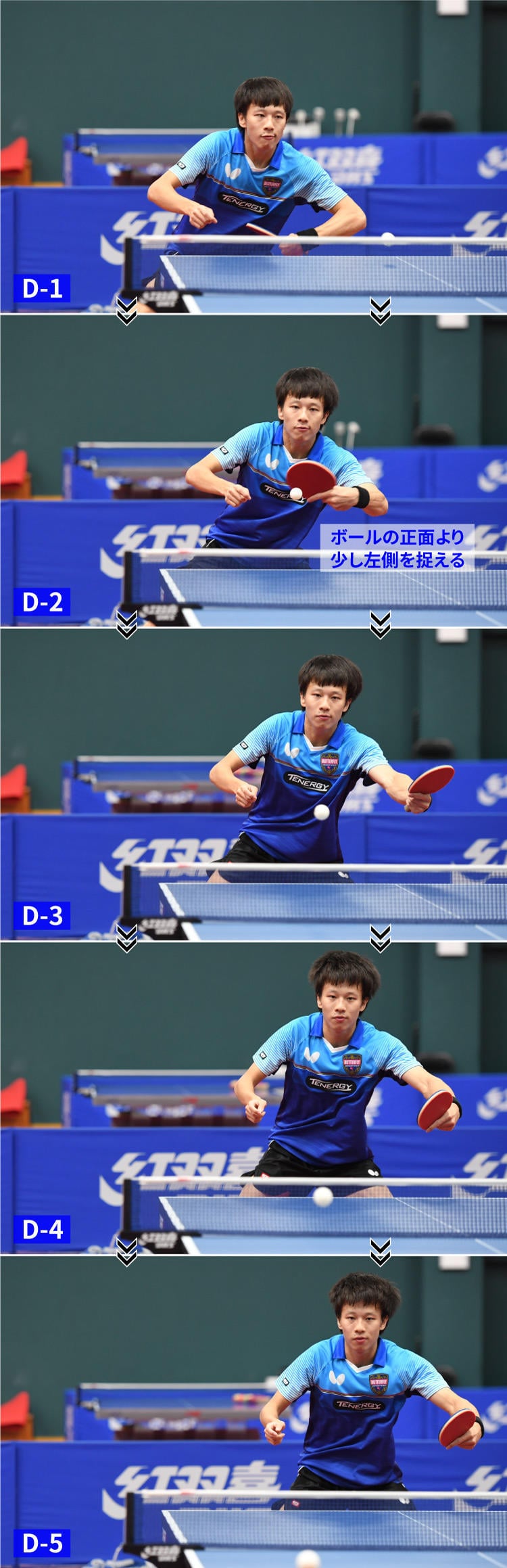 ボールの正面より少し左を捉えるためには、準備でひねった手首の返しを抑え気味にし、打球面が(右利きの相手の)バック側を向いているときに打球している林高遠のスイングを参考にしてほしい(写真D-2)。