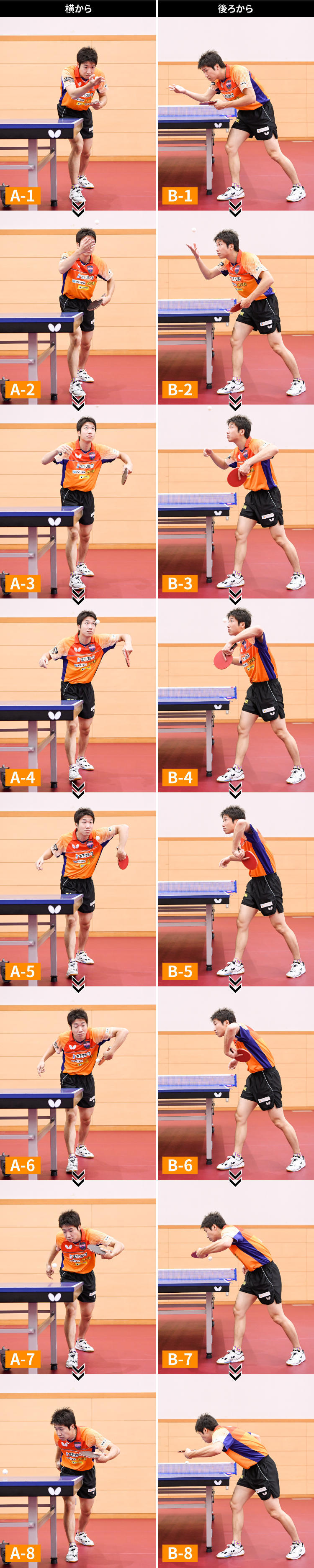 YGサービス(写真A-1~8、B-1~8)は、今でも出す選手が少ないサービスなので、相手が取り慣れていないことが大きなメリットです。出す選手が少ない分、受ける機会も少ないので、YGサービスを完璧にレシーブできる選手はほとんどいません。