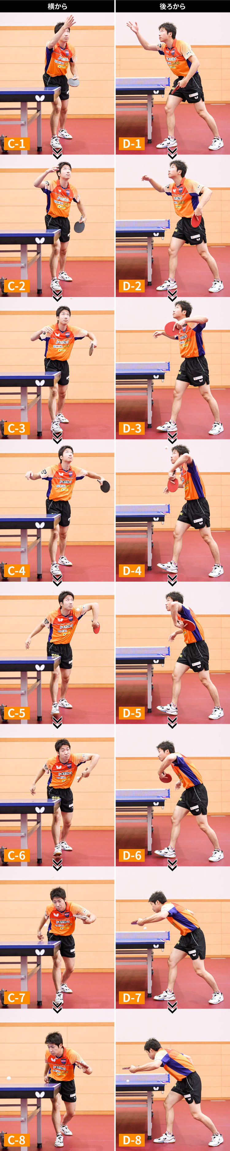 YGサービスは基本的にトスを高く上げませんが、最近ではトスを高く投げ上げてから出す「投げ上げYGサービス」(写真C-1~8、D-1~8)を練習しています。
