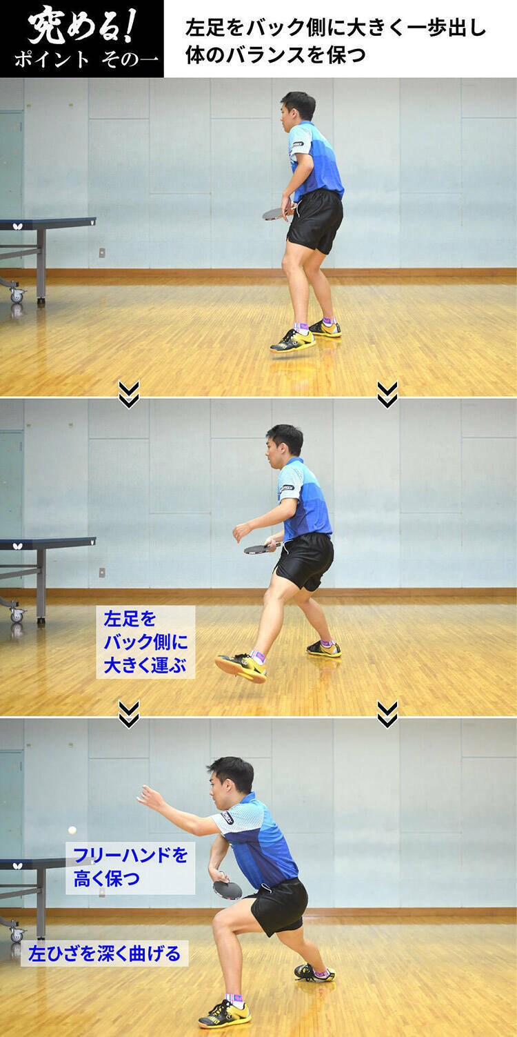 この技術を行うためには、「左足をバック側に大きく一歩出す」ことが先決です。そうして、バック側の厳しいコースに来たボールに対して、できるだけ体の近くでバックハンドドライブできるように準備してください。