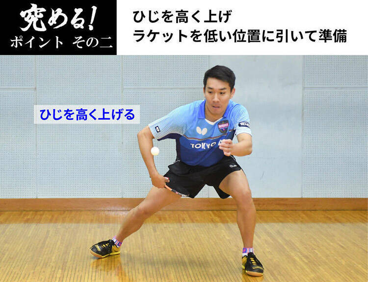 ボールに横回転をかけるためには、「準備で高く上げたひじをスイング中に下げない」「ボールを呼び込み、打球点を低くする」の2つを意識してスイングしてください。そうすると、ボールの横をこすりやすくなります。